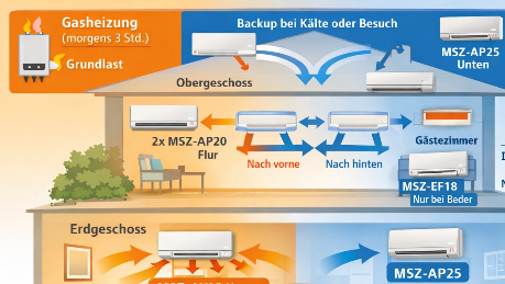 Heute läuft bei uns die Luft/Luft-Wärmepumpe im Hauptbetrieb und übernimmt den Großteil der Heizleistung. Die Gasheizung bleibt bewusst im System – allerdings nur noch als Backup, falls sie wirklich benötigt wird, zum Beispiel an sehr kalten Tagen oder in besonderen Situationen. Auf diese Weise kann ich vorhandene Ressourcen weiter nutzen und gleichzeitig den Verbrauch fossiler Energie deutlich reduzieren.