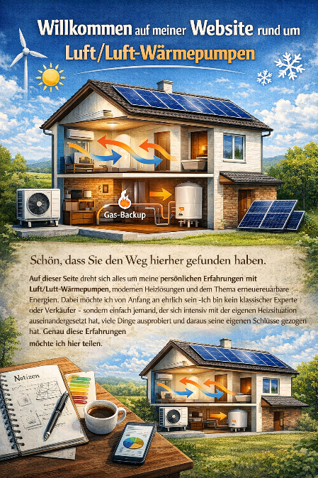 Auf dieser Seite dreht sich alles um meine persönlichen Erfahrungen mit Luft/Luft-Wärmepumpen, modernen Heizlösungen und dem Thema erneuerbare Energien. Dabei möchte ich von Anfang an ehrlich sein: Ich bin kein klassischer Experte, kein Energieberater und kein Verkäufer. Ich bin einfach jemand, der sich intensiv mit der eigenen Heizsituation auseinandergesetzt hat, viele Dinge ausprobiert und daraus seine eigenen Schlüsse gezogen hat.