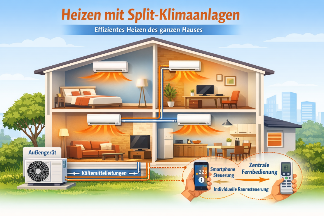 Split-Klimaanlagen sind längst mehr als reine Kühlgeräte. Durch die Nutzung des Wärmepumpenprinzips sind sie in der Lage, Räume effizient, schnell und komfortabel zu beheizen. Mit mehreren Innengeräten können sie sogar ein ganzes Haus flexibel und energiesparend beheizen und dabei die Luftqualität verbessern. Für Haushalte, die sowohl im Sommer kühlen als auch im Winter heizen möchten, stellen Split-Klimaanlagen eine praktische, energieeffiziente und flexible Alternative zur klassischen Zentralheizung dar. (Autor Uwe Schöne)
